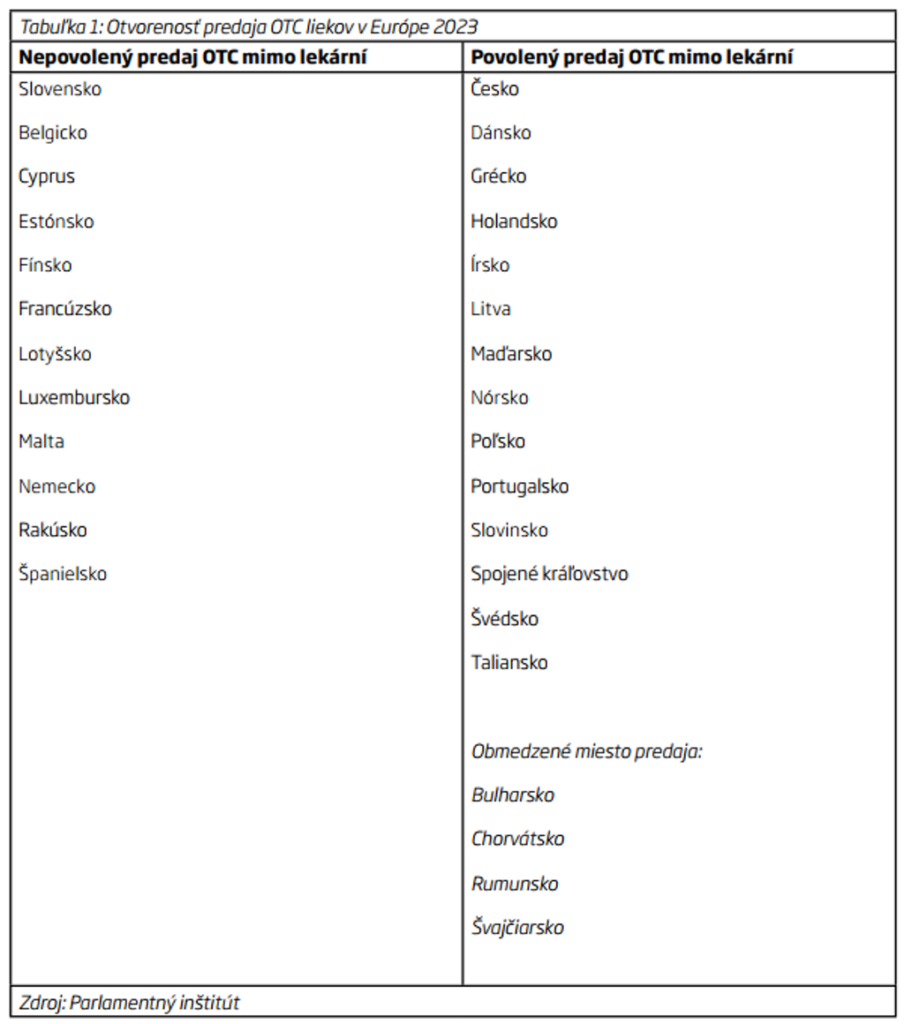 Z pohľadu otvorenosti predaja OTC liekov v Európe nepanujú jednotné pravidlá. Zhruba polovica krajín umožňuje predávať OTC lieky mimo lekárne za rôznych podmienok. Ich súčasťou je vždy zúžený zoznam OTC liekov a prípadné ďalšie podmienky (školenia, skladovacie podmienky…).