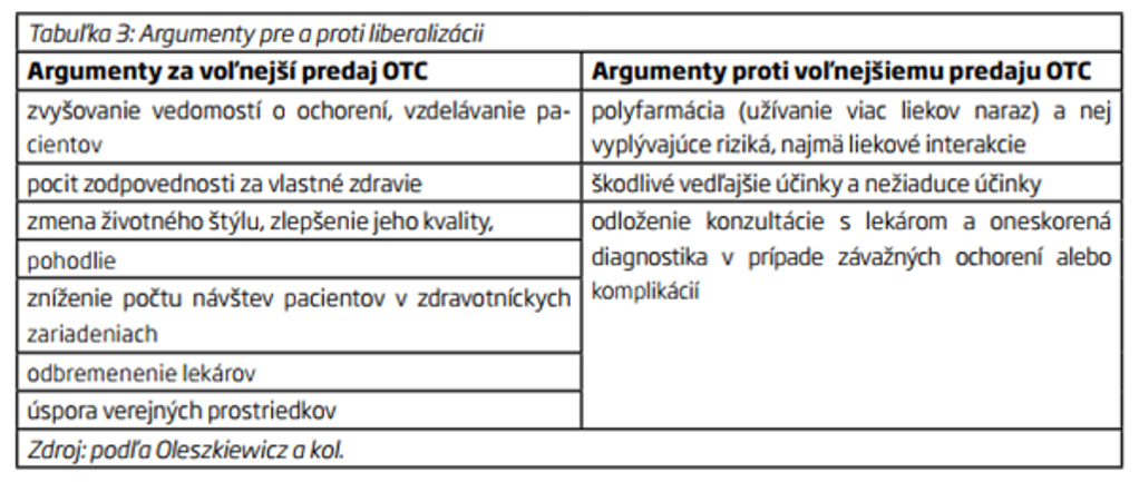 Argumentami za liberalizáciu je vyššia dostupnosť, emancipácia pacienta, zníženie nákladov v systéme aj nákladov pre pacienta a odľahčenie ambulantných lekárov. Argumentami proti sú najmä potenciálne nežiadúce účinky, či oneskorená diagnostika. V literatúre sú zhrnuté takto: