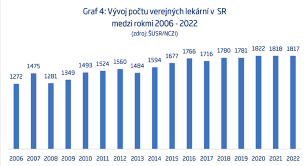 Počet verejných lekární za posledných 15 rokov narástol asi o 50% na úroveň cez 1800 lekární, čo je po prepočte na obyvateľa zhruba o 30 % viac, ako v ČR. Podľa údajov Eurostatu sa jedná v Európe o priemernú až mierne nadpriemernú hodnotu.