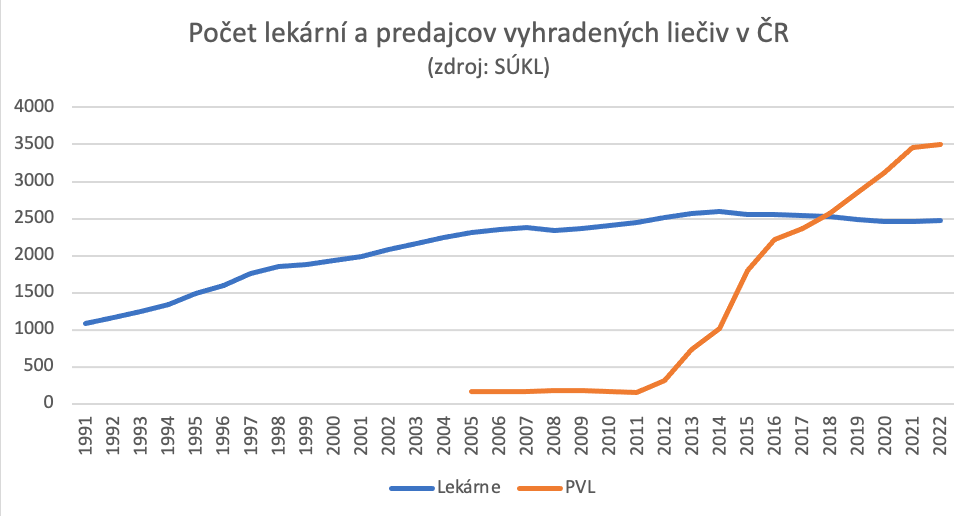 Na dostupných dátach z výročných správ SÚKL vidno prudký nárast počtu predajných miest VLP od roku 2012, ktorý vykazuje výraznejšie spomalenie až v roku 2022, čo je zároveň ale posledný dátový bod. Naopak klasické lekárne v Česku zažili veľký rozmach v 90.rokoch a ich počet kulminoval v roku 2014. Odvtedy počet lekární mierne (-4,7%) klesol.