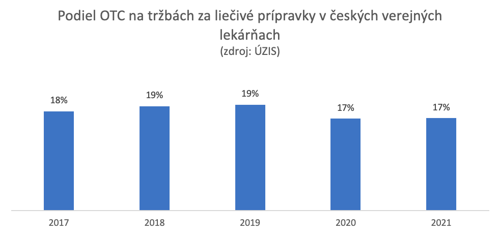 V tomto (relatívne krátkom) sledovanom období rástli nominálne tržby z predaja OTC najpomalším tempom spomedzi sledovaných položiek. Vidieť značný prepad tržieb v roku 2020, môžeme preto špekulovať, aká bola úloha pandémie Covid 19 vo vývoji tržieb za predaj OTC. Podiel OTC na tržbách sa za toto obdobie zmenil len veľmi mierne.