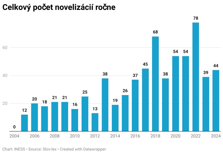 Odpoveď je krátka a jasná – nie. Počet zmien 10 kľúčových zdravotníckych zákono v rokoch 2023 a 2024 prevýšil historický priemer. Priemerne sme za posledných 21 rokov zaznamenali 32,67 novelizácií ročne, kým v minulom vydaní to bolo 31,7. Priemerné dlhodobé tempo novelizácií tak od roku 2022 narástlo o 3%. Celkový počet novelizácií týchto zákonov dosiahol hodnotu už 686.